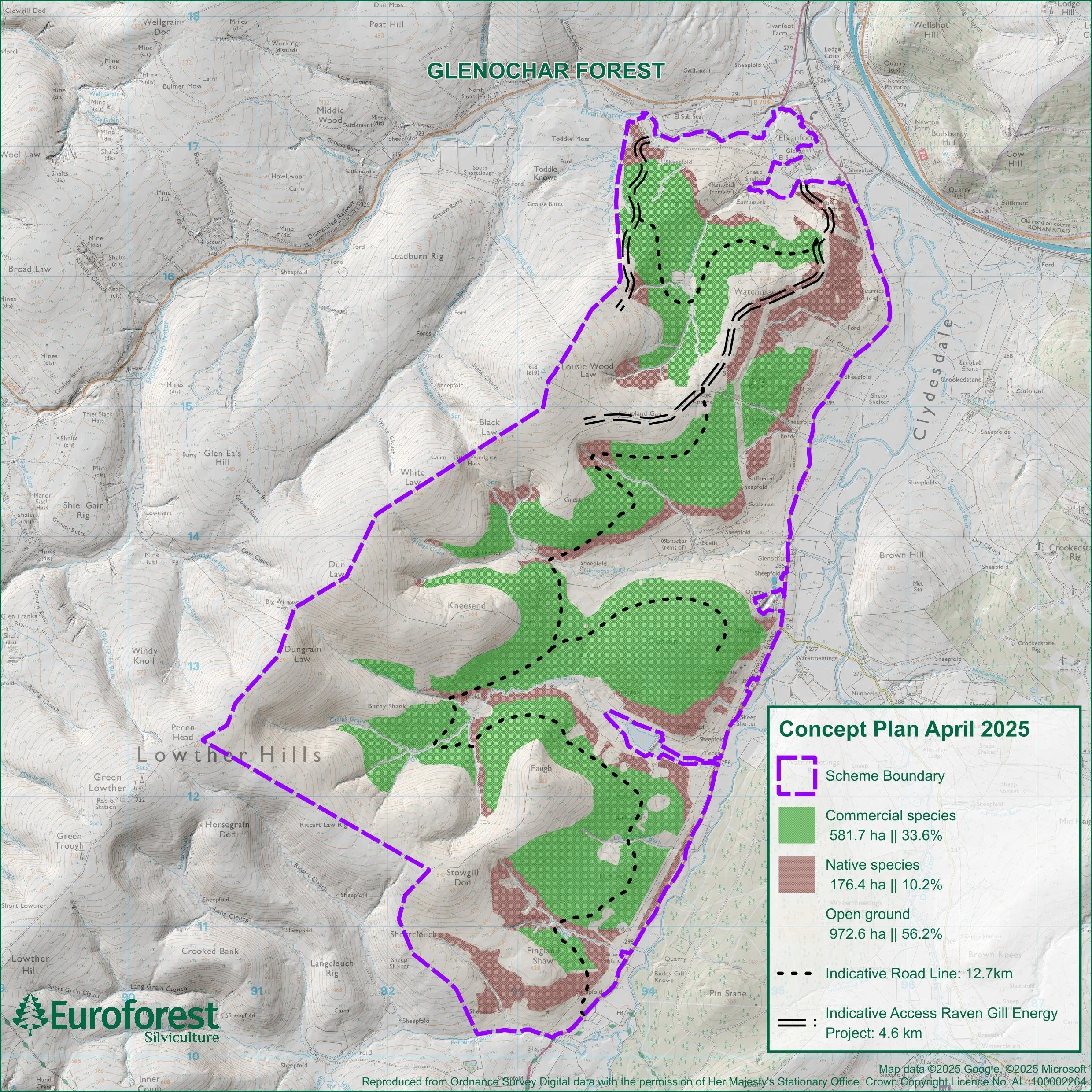 The planting of new trees at Glenochar Forest will result in the linking of several new woodland creation projects, designed to complement existing forests and local landscape features. Of the 1,731 ha scheme area, 878 hectares of plantable land is planned to be developed over the life of the project. The site will be broadly developed as a mixture of native and commercial woodland, with productive species covering around one third of the scheme area. The final woodland composition will be guided by the principle of the right tree in the right place and will be compliant with the UK Forestry Standard.
